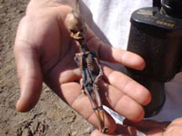 General view of the ghost town of La Noria in northern Chile, where the alleged ET skeleton was discovered in 2003. (Credit: Alberto A. Espinoza)As Muñoz dug in the area around La Noria’s abandoned church, he came across a white cloth tied by a violet ribbon, finding inside “a strange skeleton no bigger than 15 cm [the size of a pen]. It was a creature with hard teeth, a bulging head with an additional odd bulge on top. Its body was scaly and of dark color. Unlike humans, it had nine ribs,” stated the article in La Estrella de Arica.