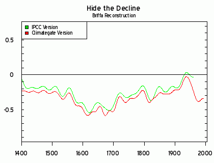 The diagram below shows the IPCC version of the Briffa reconstruction (digitized from the IPCC 2001) compared to actual Briffa data from the Climategate email of October 5, 1999, smoothed using the methodology said to have been used in the caption to the IPCC figure (a 40 year Hamming filter with end-point padding with the mean of the closing 20 years).