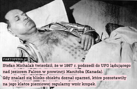 As a final consideration i'd like to remind you of the infamous 1967 Falcon Lake Incident with Stefan Michalak whose full narrative includes the up close and personal viewing of a real life flying saucer, audible voices of occupants coming from inside the ship, and then finally an exhaust port burn that left Michalak scared and scarred - it is a premiere tale and if you don't know about it I'm not sure what you're doing here at this forum. Either way, here are some interesting bits of info that document it along with the classic photo of Michalak and his burns - taken from a Polish website, just to acknowledge my appreciation for my Grandmothers's exceptional perogies and cabbage rolls, as she's turning 99 this May, so Poland is on my mind.